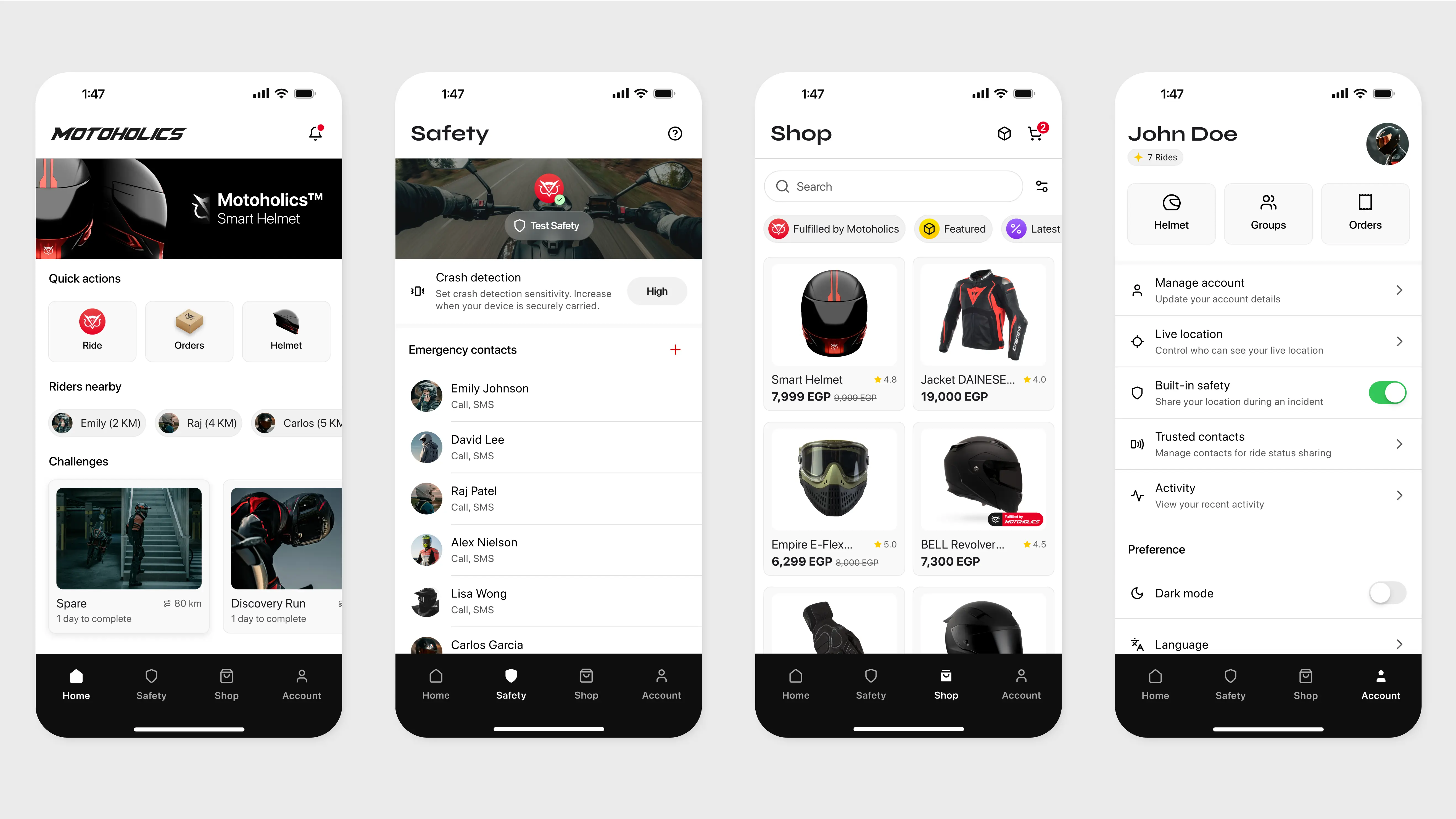 Motoholics is an all-in-one mobile app for motorcycle enthusiasts, combining route planning, real-time analytics, social connectivity, and an e-commerce platform for motorcycle gear. As the first mover in the market, Motoholics fills a significant gap by offering a holistic, user-centered app tailored specifically to riders’ needs. Paired with the Motoholics Smart Helmet, the app prioritizes safety and connectivity, creating an unparalleled riding experience. Within six months, Motoholics attracted 50,000 users and secured initial funding from the AUC Venture Lab Accelerator. The brand further raised its profile by sponsoring events like Innovation Hub, reaching both tech and motorcycling communities.