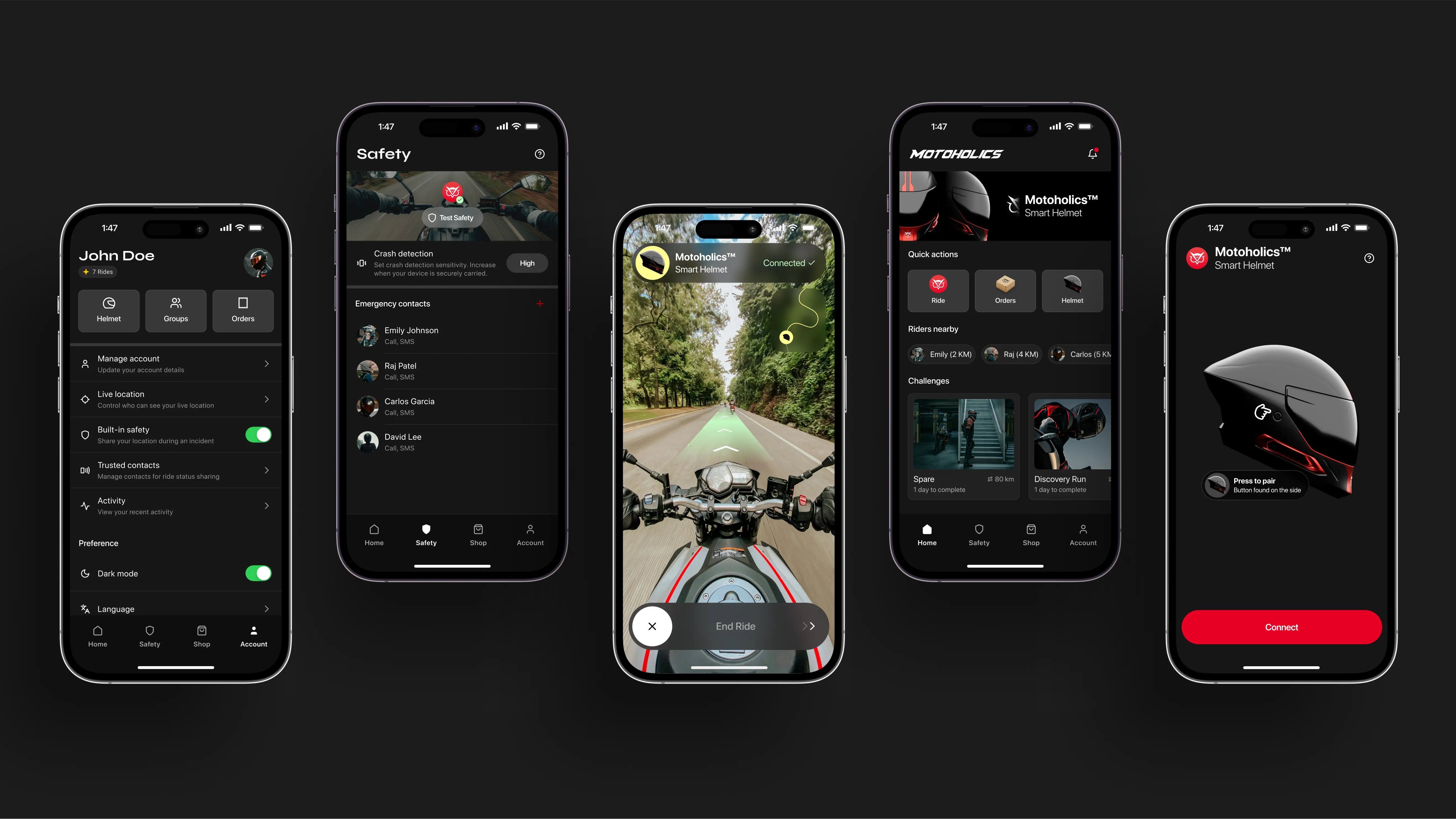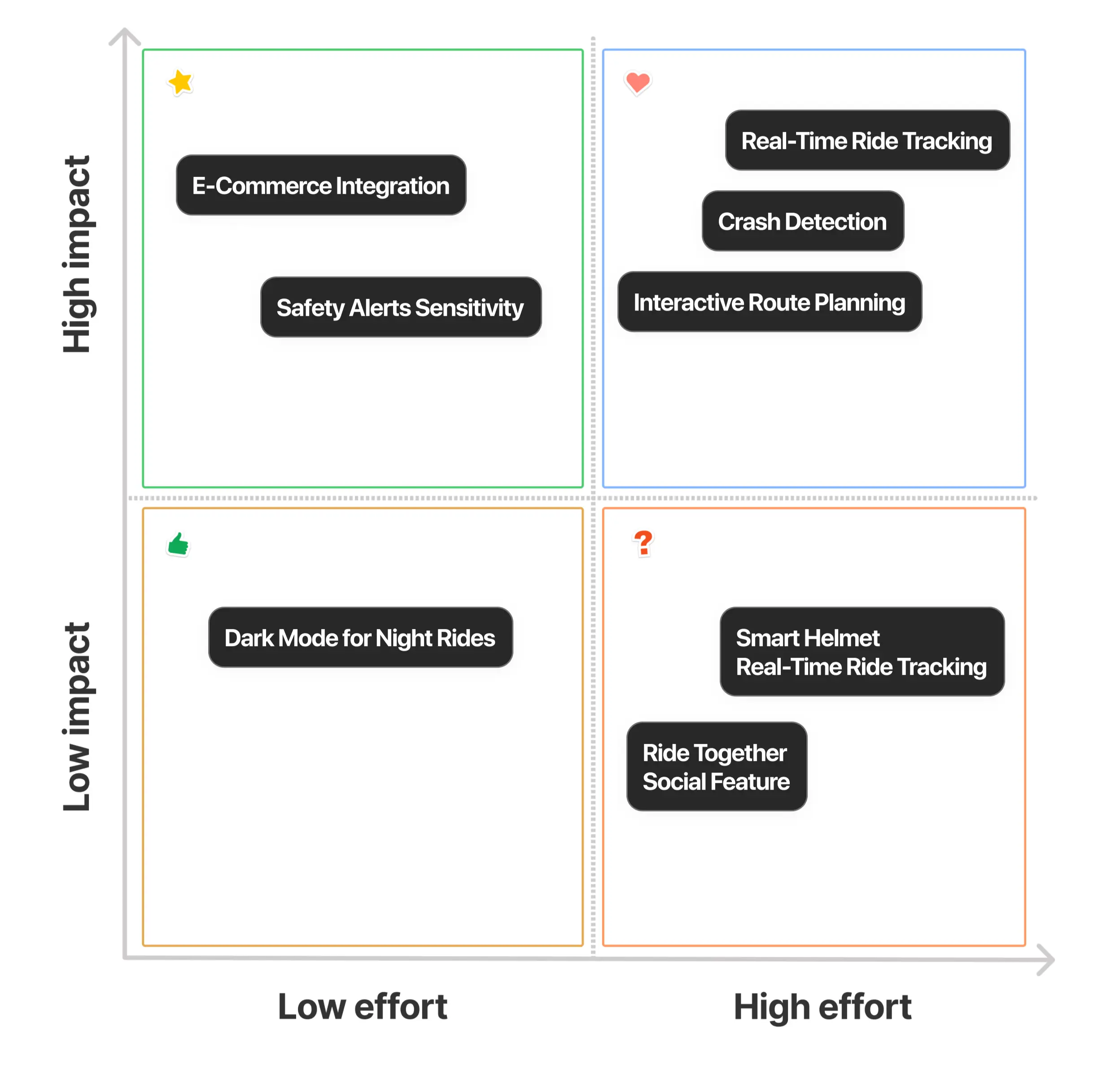 Additional features like social connectivity and smart helmet integration were planned for future iterations, allowing us to refine and expand the app based on user feedback. This approach ensured a lean yet effective release, supporting continuous improvement and adaptability to evolving user needs.